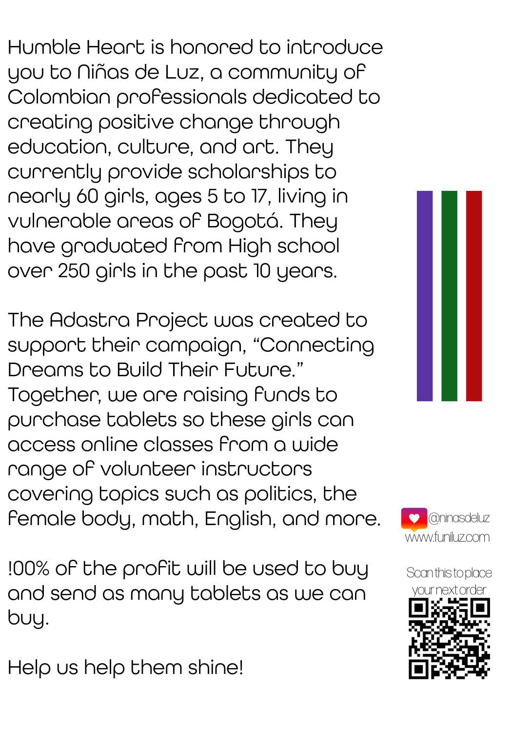 Humble Heart is honored to introduce you to Niñas de Luz, a community of Colombian professionals dedicated to creating positive change through education, culture, and art. They currently provide scholarships to nearly 60 girls, ages 5 to 17, living in vulnerable areas of Bogotá. They have graduated from High school over 250 girls in the past 10 years. The Adastra Project was created to support their campaign, “Connecting Dreams to Build Their Future.” Together, we are raising funds to purchase tablets so these girls can access online classes from a wide range of volunteer instructors covering topics such as politics, the female body, math, English, and more. 100% of the profit will be used to buy and send as many tablets as we can buy. Help us help them shine!